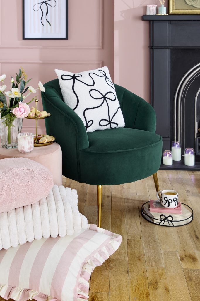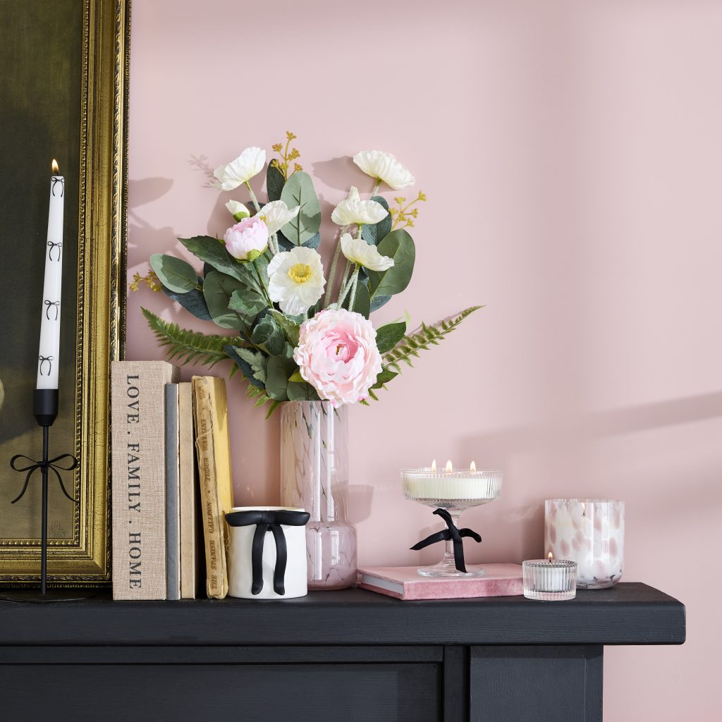 B&M’s Quiet Luxury range pairs delicate black bows with soft blush pinks for a contemporary, elegant vibe. Bow accents can be found on mirror trays, playful cocktail glass candles, chic cushions and monochrome bedding. We love their simple black bow taper candle holders, as suited to the mantelpiece as the dining table, and a bargain at £1.50 each.